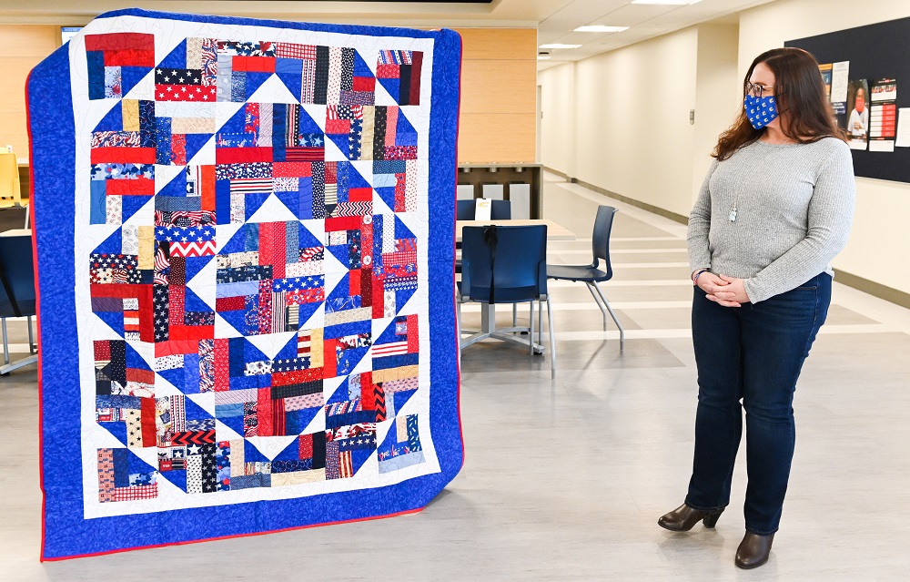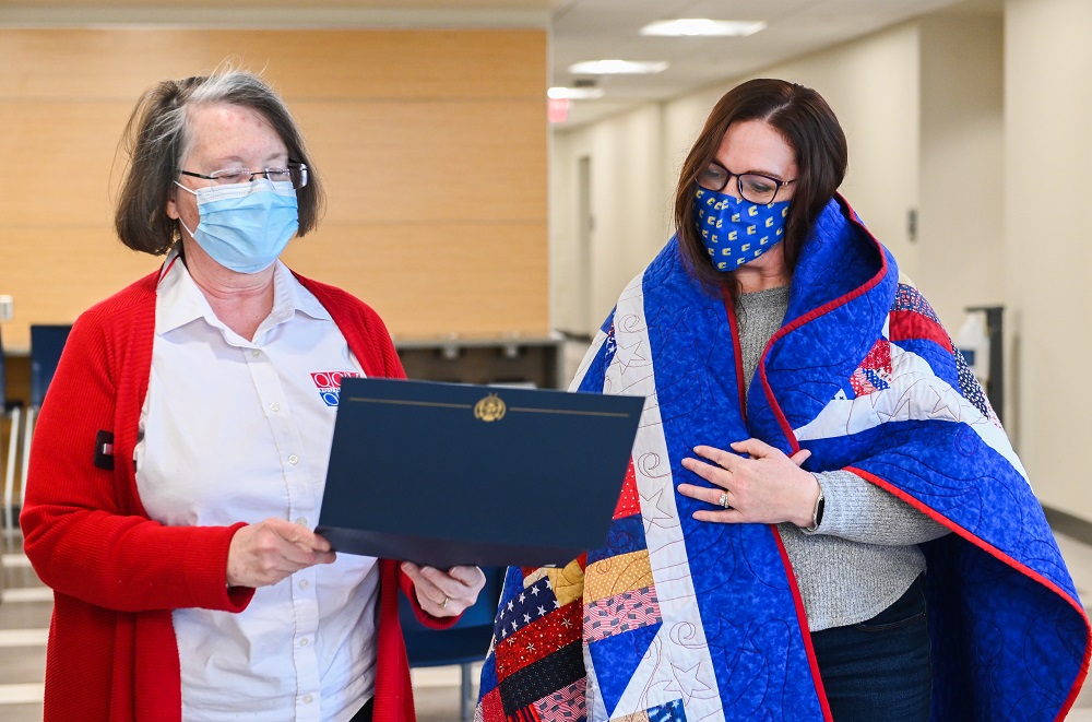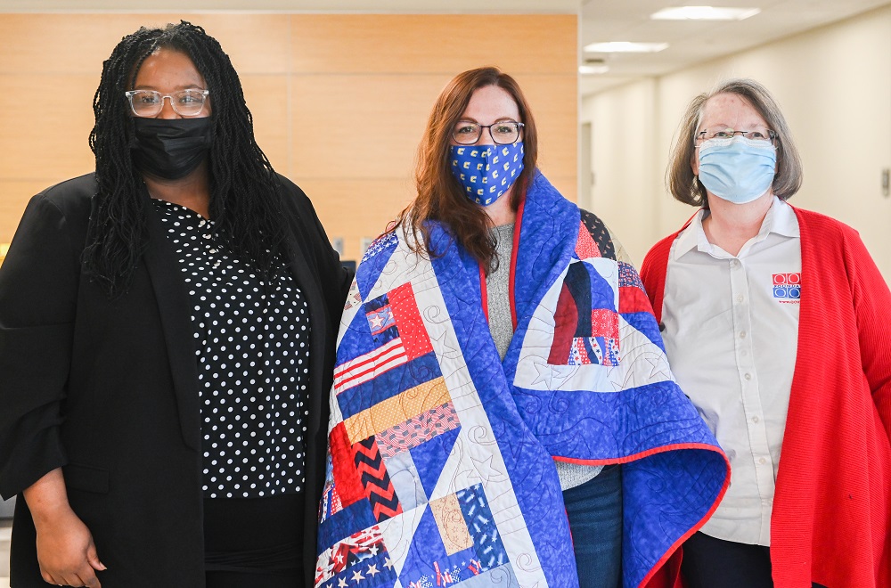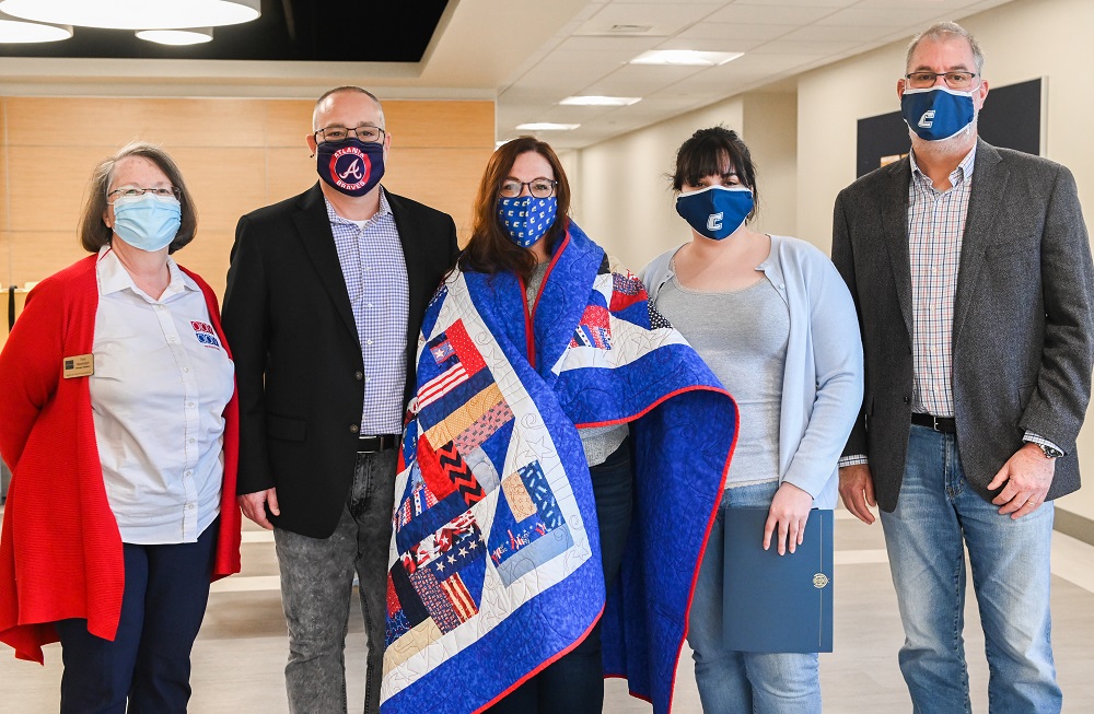 Sandra Cordell, Director of the Veterans Entrepreneurship Program in the UTC Gary W. Rollins College of Business, was awarded a Quilt of Valor from the Quilts of Valor Foundation and UTC Veteran Student Services on Wednesday, January 27, 2021.