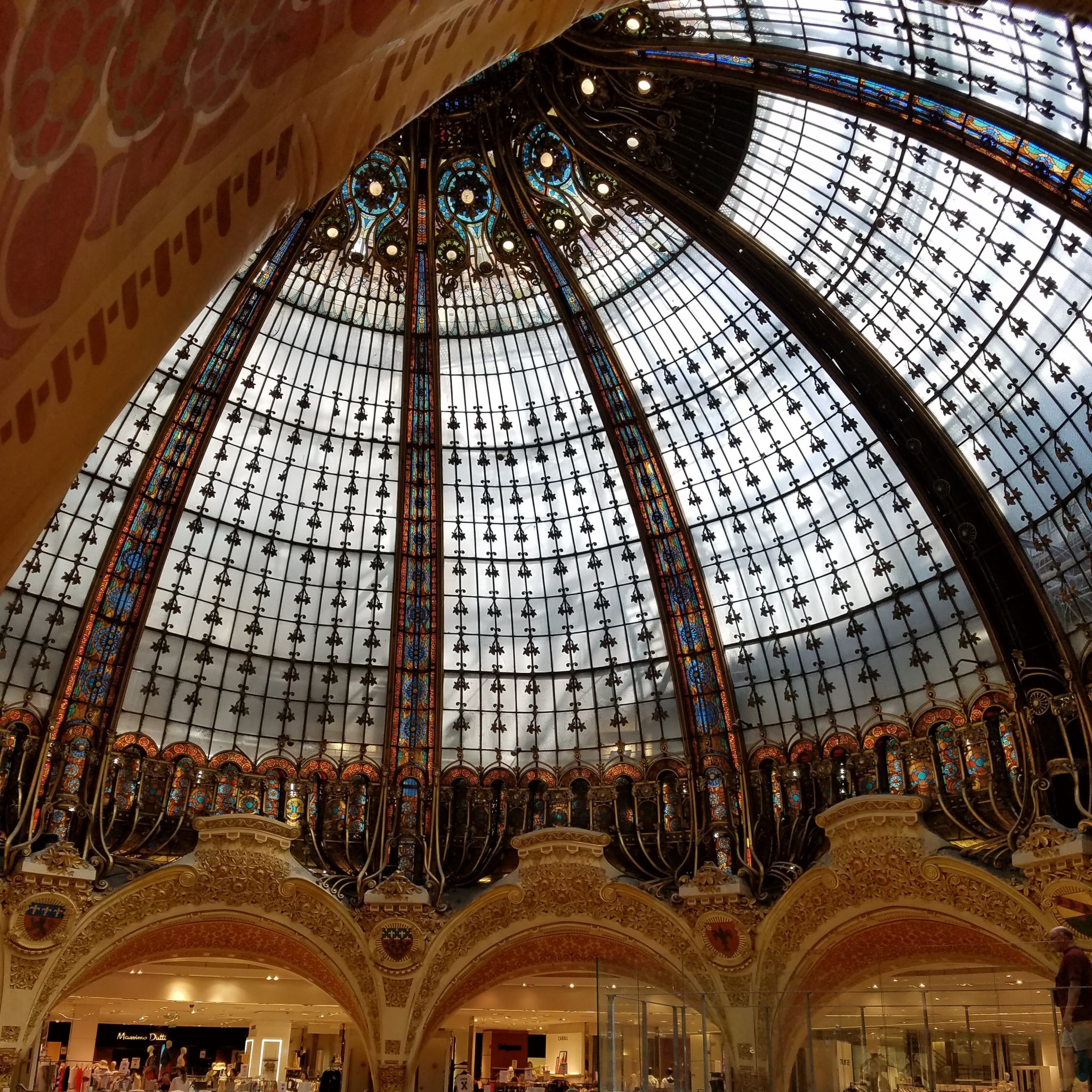 I liked that Paris had long hours of daylight. The sun would rise around 6:30am and it would get completely dark around 11 pm, and I think that encouraged everyone in my group to be outside exploring the city. We would go on walks to some of the parks that were around our host house or take the metro into the center city to see the various shops. One of the shops we went to was a type of farmers market. Usually, the place where they set up is just a wide sidewalk, but on Sundays, the sidewalk is full of booths and people looking at the wares. Another shop that we went to multiple times was Galeries Lafayette, which is a very large indoor shopping mall with multiple floors. The mall had a decorative stained-glass ceiling and a glass walkway on the top floor to go out into the middle to take pictures.