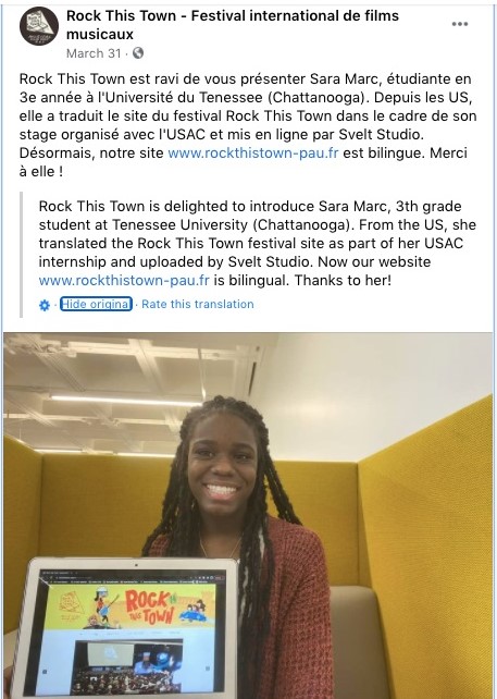 My experience with USAC’s Global Perspective Virtual Internship was a unique experience that challenged my communication skills, pushed the limits of my French language learning, and offered information on how to be a valuable member in the working environment. The internship was very interactive and included two different components; one being the seminar section, in which the students participating in the program would discuss different types of readings in reference to building intercultural relationships, researching and learning about the different moving parts of our host organizations, developing and reflecting our own personal brand and even discussing the cultural differences between other students’ internship organizations. The second part of the internship was the work I did in Pau, France with the Méliès cinema. With the Méliès cinema, I worked with Xavier le Falher communicating about what the Méliès cinema was, their connection to the public and the festival they host annually called Rock this Town. The work I did for the organization was preparing documents for the festival by translating them from French to English and occasionally English to French. Notably, I translated the home and about us section on the website, which allowed for a bilingual webpage.