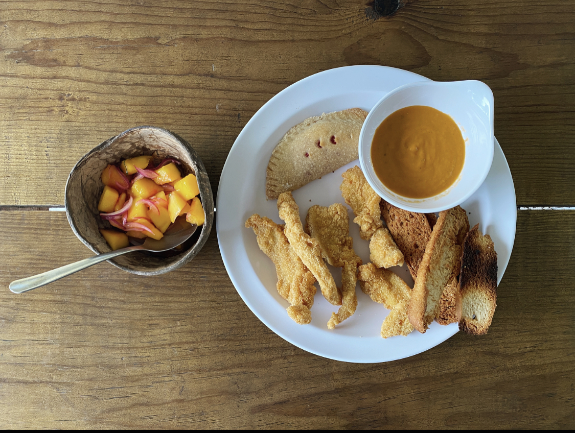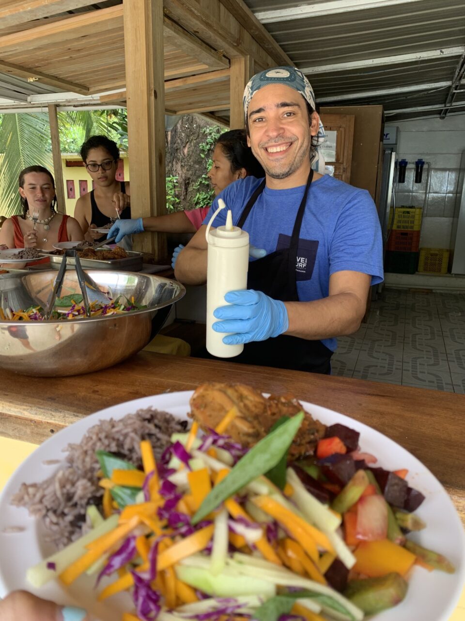 I really enjoyed the food in Panama. The food was very healthy, fresh, and delicious. I was originally worried about what foods would be available, as I have dietary restrictions. Our chef on campus, Hugo, cooked us amazing dishes. There were two of us who were vegetarian and two of us who were gluten-free. He often made meals that all of us in the program could eat, and if not, he would make each of us with dietary restrictions separate meals. For breakfast, we often had eggs, fresh fruit, pancakes, yogurt, and coffee. For lunch and dinner, we often had different variations of chicken, rice, cooked vegetables, salad, and juice. The restaurants also served very delicious, healthy food. My favorite meal was during our last night in Bocas. We traveled to the nearby Carenero island to a restaurant called Receta Michilá, where I had one of the best meals of my entire life. Dinner was fish and breadfruit, and dessert was chocolate mousse topped with chili powdered cacao nibs. The menu was small and limited to what foods were local and caught that day. After eating, we took a tour of the extensive garden located behind the restaurant in the rainforest. It was one of my favorite nights during the trip.