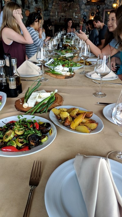 As a vegetarian, I have discovered the trend is not as common outside of the U.S. Over time, I have chosen to be flexible in my preferred diet, especially when I am abroad, for ease and to avoid missing out on local taste, assuming I may not have another opportunity to try! In my opinion, a large aspect of traveling is experiencing the food. Due to the Balkans geographical location, the seafood is plentiful, thus popular; and more cost-friendly than what we are used to. Additionally, there was not a shortage of meat and the wine was omnipresent. The menu options are not necessarily foreign from what we are accustomed to – pizza, pasta, vegetables, etc. but the preparation is, resulting in the distinctiveness. Our meals were mostly family-style, where the table ordered various dishes to share.