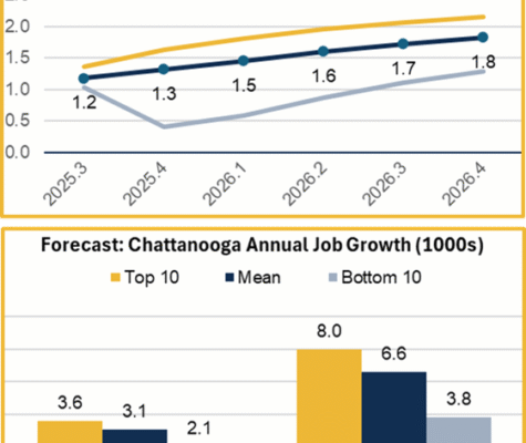 The CRER produces quarterly forecasts of the growth of nonfarm payroll employment in the Chattanooga MSA. Forecasts depend on the consensus forecast of the U.S. economy from the Blue Chip Economic Indicator survey. Our new forecast is a net gain of twelve hundred jobs in the third quarter, and for growth to rise throughout 2026.…