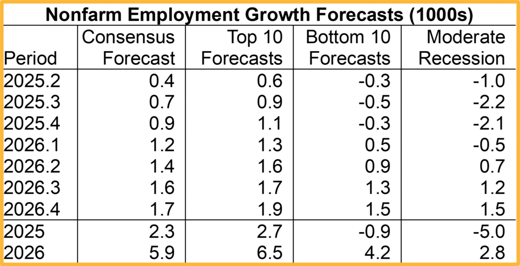 In light of the ever-changing national situation and outlook, the CRER has released a special forecast outside of its regular schedule of quarterly forecasts. The CRER’s updated forecast provides three scenarios based on the Blue Chip survey, and one based on the occurrence of a moderate recession along the lines of the 1990 and 2001 recessions. Under the consensus forecast for the US economy, local job growth would be slow throughout 2025 and pick up in 2026. The two recession scenarios (mild and moderate) indicate a loss of 900 and 5,000 jobs in 2025, respectively, along with slow growth in 2026. Under the most optimistic scenario, the local economy would gain 2,700 jobs in 2025, which would be the slowest annual growth since 2014.