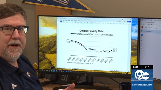 Channel 9 News featured recent CRER research in a story about poverty trends in the Chattanooga metro area. CRER director and chief economist Howard Wall was quoted about some of this findings and their implications: