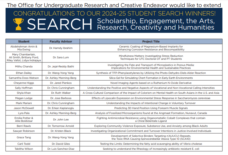 May 31, 2024: Mithu Chanda has been nominated for the UTC SEARCH Award (The Scholarship, Engagement, the Arts, Research, Creativity, and Humanities) for 2024-2025 academic year. Under this program, he will have the opportunity to receive scholarship from UTC and carry out research under the guidance of esteemed UTC faculty. Congratulations Mithu!