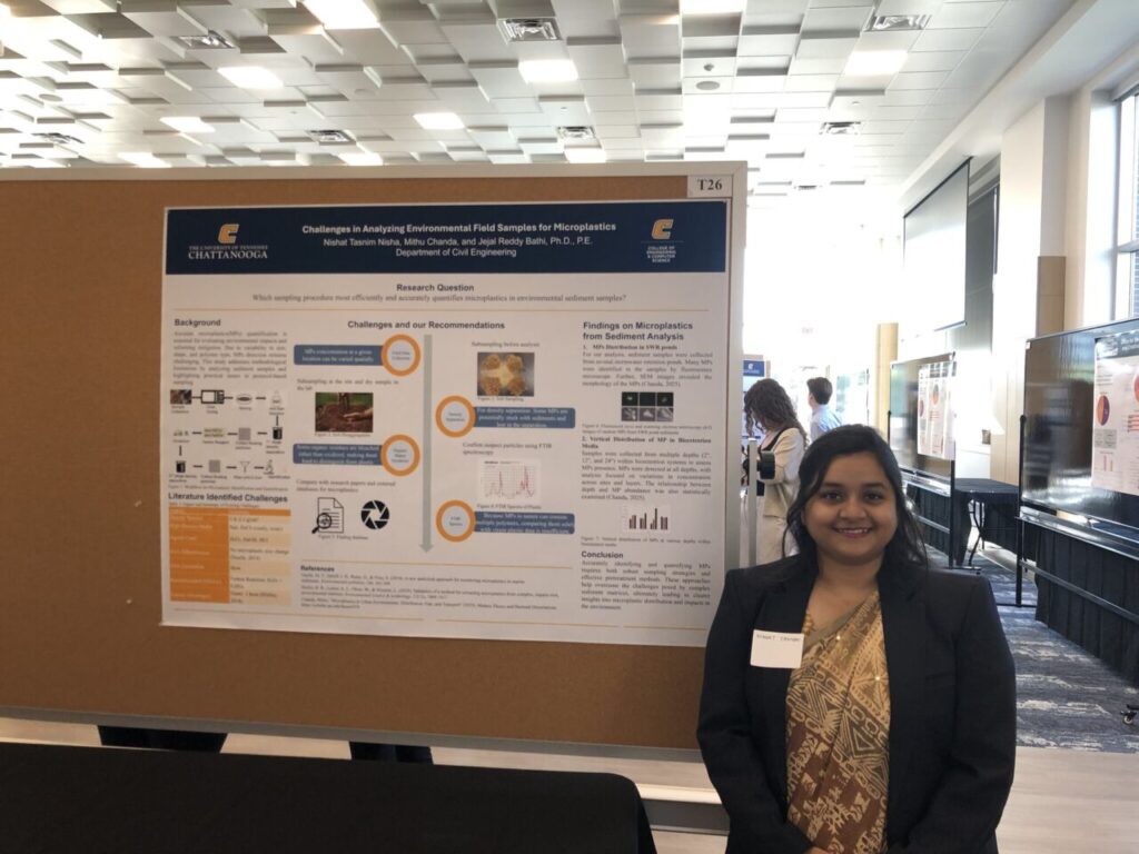 April 9, 2025: Our graduate student, Nishat Tasnim Nisha, presented her first graduate posters at the UTC Spring Research and Arst Conference at UTC University Center. Her poster titled “Challenges in Analyzing Environmental Field Samples for Microplastics,” explored practical limitations in microplastic detection from sediment samples — including pretreatment, density separation, and imaging challenges.