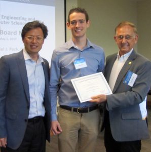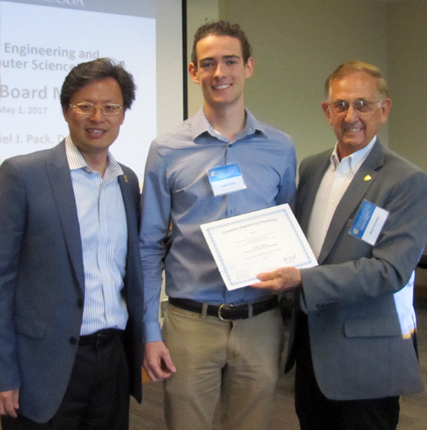 - At the May 1 meeting of the CECS Advisory Board Steering Committee senior Chemical Engineering student and Brock Scholar Cooper Tome was presented the 2017-18 Tennessee Engineering Foundation (TEF) Scholarship Award by Steering Committee member and TEF Board Member Mr. Mack McCarley. Cooper’s research efforts are extensive, and his work with the late Dr. Frank Jones led to his participation in an National Science Foundation-funded program at Emory University last summer. From the a highly competitive cohort of participants in that program, he was selected to travel to Japan for 10 weeks later this month. While in Japan Cooper will be studying micro and nano structures of tissues, and will be afforded the opportunity for travel and cultural immersion. Cooper has been very active in service and leadership endeavors in the College, and has recently been elected President of both the Student Chapter of the American Institute of Chemical Engineers and the Tau Beta Pi Honor Society.