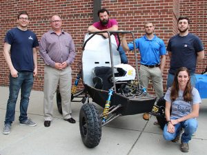 Racing Mocs team members with SAE Baja vehicle. For the eleventh consecutive year an interdisciplinary design team of CECS students under the mentorship of Assistant Professor of Mechanical Engineering Dr. Trevor Elliott are putting the finishing touches on the design and construction of a SAE Baja vehicle as part of the (Society of Automotive Engineers) Collegiate Design Series. With the continued support of corporate partner, DENSO North America Foundation, the team has high hopes for success in competition later this month in Pittsburg, Kansas. One hundred universities both domestic and foreign will be in competition including Rochester Institute of Technology, University of Alabama, Cornell University, and the University of Nebraska. Best of luck to the Racing MOCS!