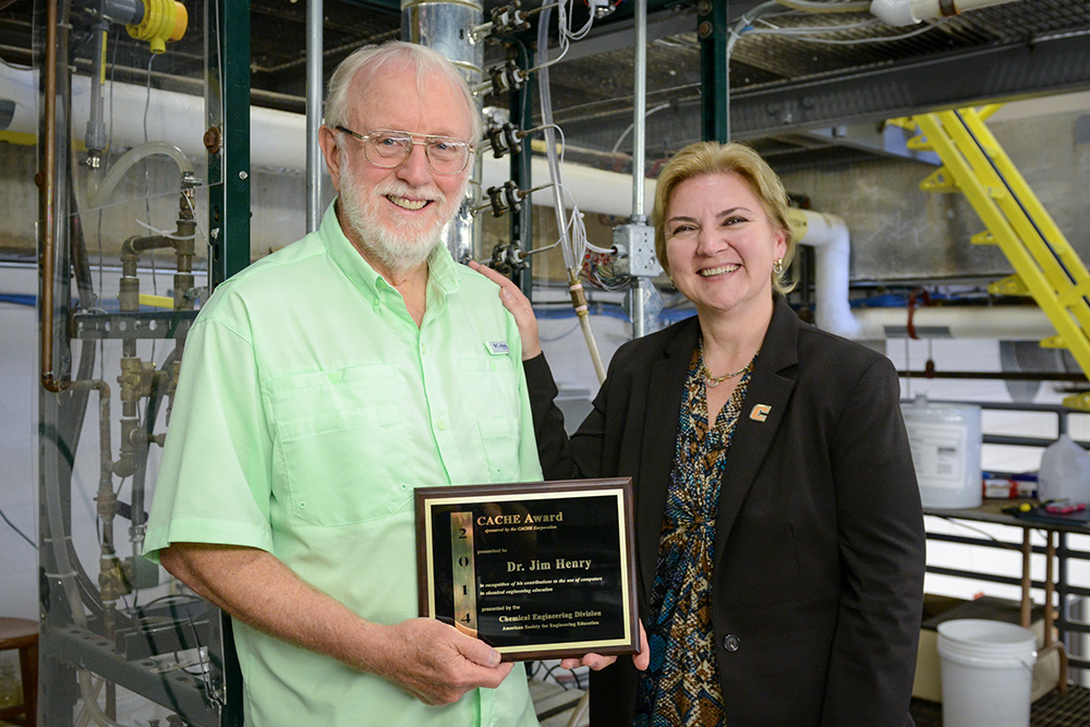 On September 7th at 10 a.m., the laboratory in the EMCS Building located in room 119, will be named in honor of Professor Emeritus Jim Henry. Pictured with Associate Dean of the College Dr. Neslihan Alp at his receipt of the CACHE Award from the Engineering Division of the American Society of Engineering Education (ASEE), Dr. Henry’s commitment to innovation in developing remotely operated laboratory equipment, garnered him and the College national recognition. Through his generous gift to the College, a fund was established to support student research, equipment acquisition, and other welcomed enhancements to the Chemical Engineering Program.