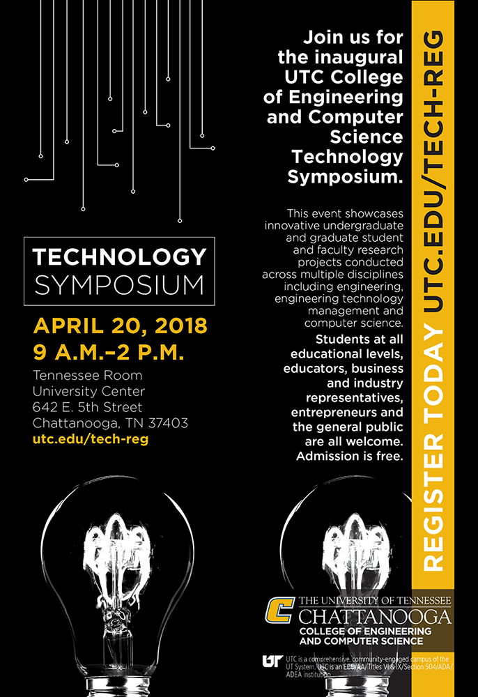On Friday, April 20th, the inaugural CECS Technology Symposium will be held from 9 a.m. – 2 p.m. in the Tennessee and Chattanooga Rooms of the UTC University Center, located at 642 East 5th Street. Admission is free to this event which will showcase innovative undergraduate and graduate student and faculty research projects conducted across multiple disciplines including engineering, engineering technology management and computer science. The projects will be judged by a panel of external experts, and awards will be presented in the various project categories. Students at all educational levels, educators, business and industry representatives, entrepreneurs and the general public are all welcome.