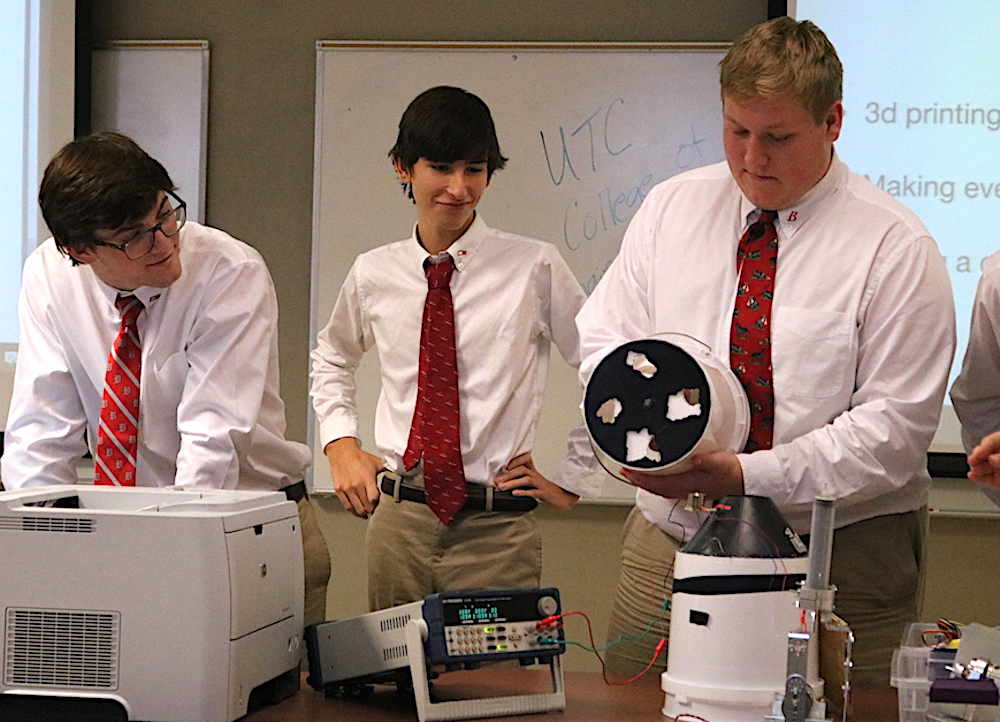 In November, Baylor School students, led by Dr. Mary Loveless, Director of the school’s IdeaLab, built prototypes of devices that would attach to drones to carry out specific tasks. In December, the students came to UTC to present the seven prototypes they constructed.