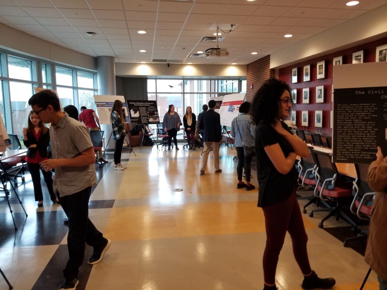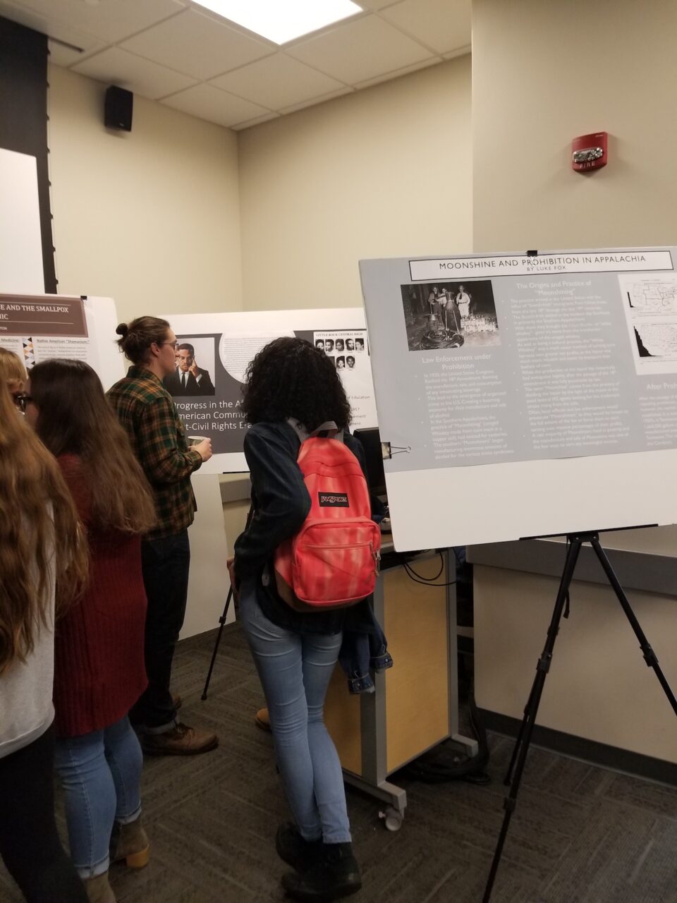 At the end of the Fall 2018 semester, students from sections 0 and 03 of Writing and Research in History showcased the posters they created for the class. The course was designed to help students learn to evaluate primary and secondary materials and use those sources to develop and answer research questions. Students in the class were required to complete a historical research paper on a topic of their choice. In addition, they created posters depicting the major points of their research project. Students then presented these posters during two conference-like sessions, attended by faculty and staff from the Department of History and others.