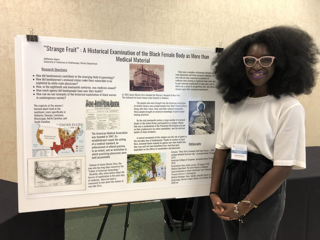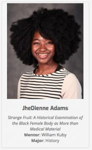 JheDienne Adams, history major and recipient of the Dr. William H. Masterson Memorial Scholarship awarded for excellent performance in history and humanities courses, was selected by the Office of Undergraduate Research and Creative Endeavor (URaCE) to participate in the Summer Research Experience for Undergraduates.  Her project was entitled “Strange Fruit: A Historical Examination of the Black Female Body as More than Medical Material” and was supervised by Dr. William Kuby.  JheDienne presented that project at the Undergraduate Research Symposium held on August 28, 2019, as seen in the pictures below.