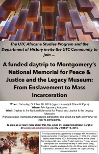 As a means to engage with the nation’s racial past and its present-day relevance, UTC’s Africana Studies program and Department of History invite students, faculty, and the wider campus community to join a funded day trip to Montgomery’s National Memorial for Peace & Justice and the Legacy Museum: From Enslavement to Mass Incarceration.