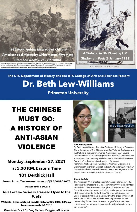 The UTC Department of History cordially invites you to a guest lecture by Dr. Beth Lew-Williams of Princeton University. Dr. Lew-Williams’ talk will focus on the history and the legacy of anti-Asian violence in the U.S.