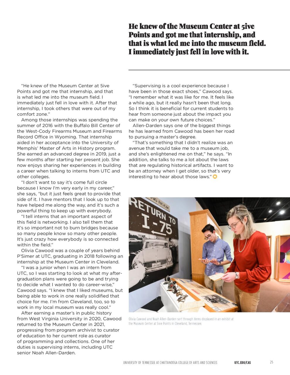 After earning a master’s in public history from West Virginia University in 2020, Cawood returned to the Museum Center in 2021, progressing from program archivist to curator of education to her current role as curator of programming and collections. One of her duties is supervising interns, including UTC senior Noah Allen-Darden.