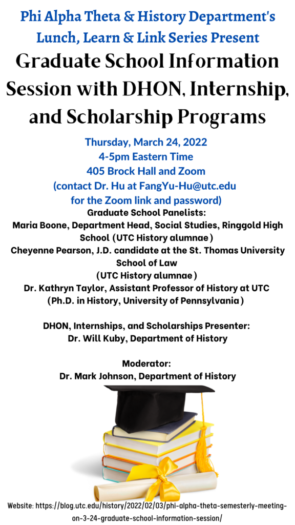 You are cordially invited to the Graduate School Information Session, sponsored by the Lambda-Pi Chapter of Phi Alpha Theta and the History Department’s Lunch, Learn & Link Series.