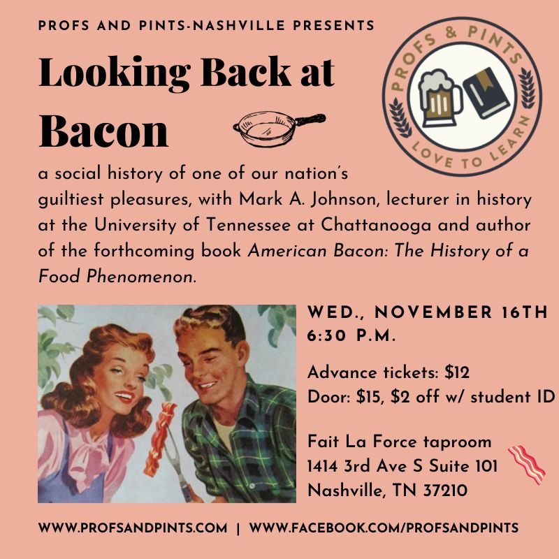 Profs and Pints Nashville presents: “Looking Back at Bacon,” a social history of one of our nation’s guiltiest pleasures, with Mark A. Johnson, lecturer in history at the University of Tennessee at Chattanooga and author of the forthcoming book American Bacon: The History of a Food Phenomenon.