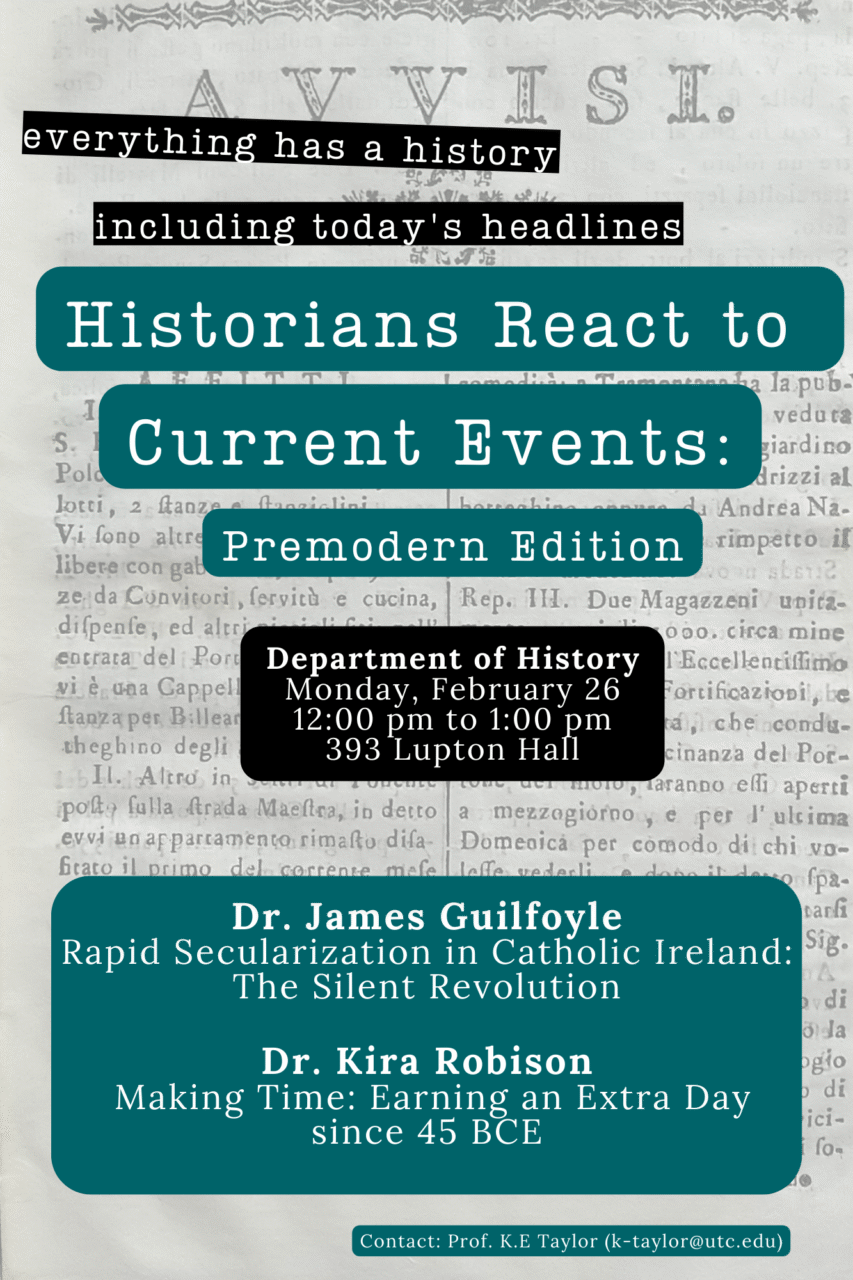 The Department of History invites you to attend our Historians React to Current Events panel on Monday, February 26 at noon. This semester, our premodern faculty will help us think about how the distant past shapes today’s headlines.