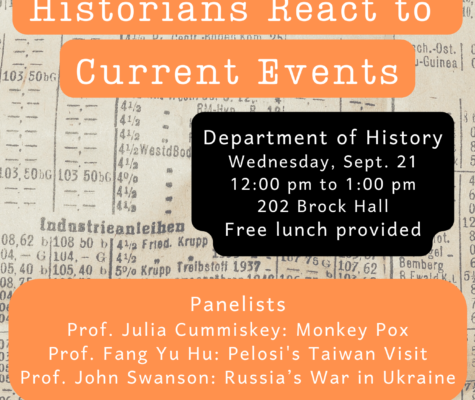 Everything has a history … including today’s headlines. Join us for Historians React to Current Events on 9/21 at 12 in Brock 202. Free lunch!
