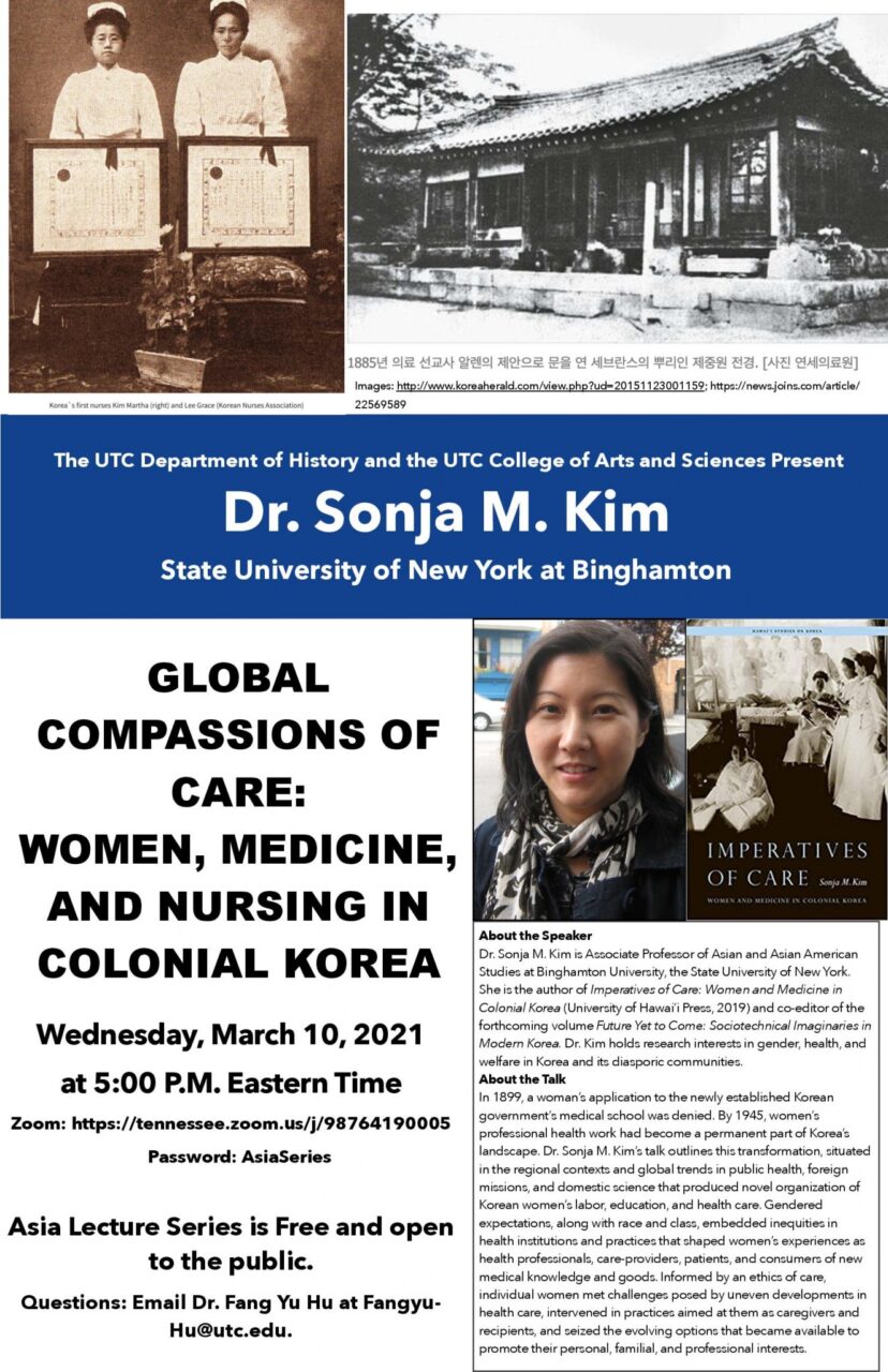 The Department of History cordially invites you to the Annual Asia Lecture Series on Wednesday, March 10, 2021. In a public lecture entitled “Global Compassions of Care: Women, Medicine, and Nursing in Colonial Korea,” Dr. Sonja M. Kim will discuss the creation of women medical professionals in Korea under Japanese colonial rule over Zoom at 5 P.M. Eastern Time.