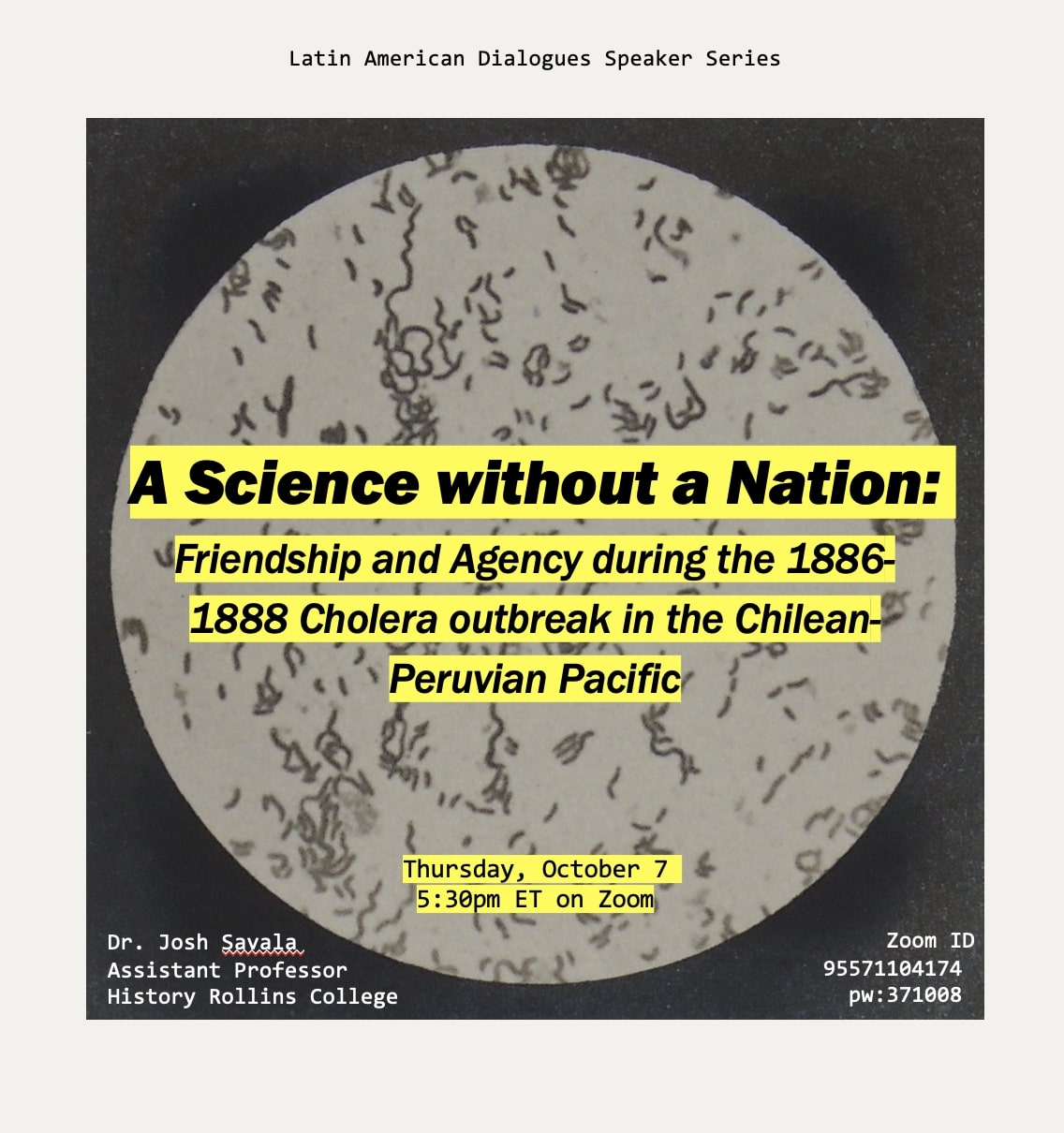 Please join us on Thursday, October 7, at 5:30 p.m. for this semester’s installment of the Latin American Dialogues Speaker Series. We’re thrilled to welcome Dr. Joshua Savala, Assistant Professor of History at Rollins College to discuss his research on social responses to transnational epidemics.