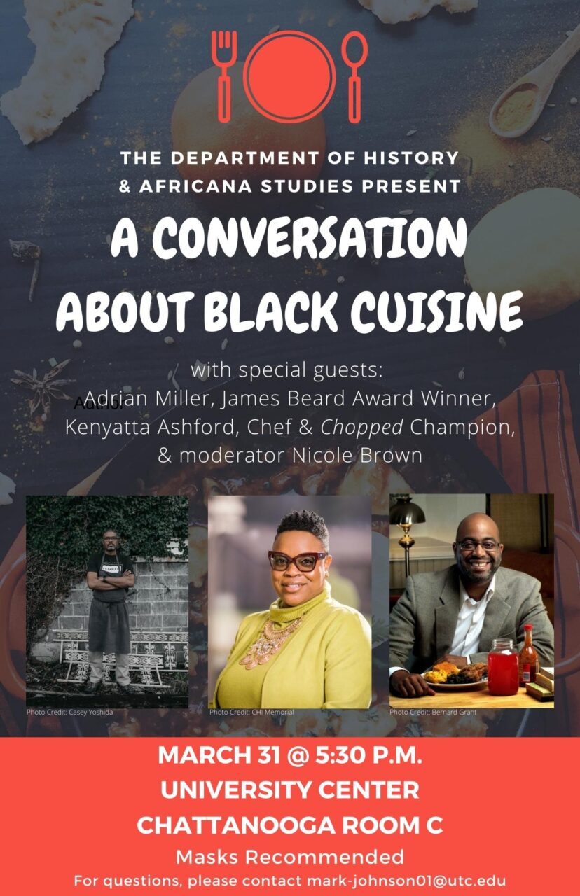 On Thursday, March 31 at 5:30 p.m., the UTC History Department and Africana Studies Program welcome special guests Adrian Miller, James Beard Award winner, and Kenyatta Ashford, Chef at Chattanooga’s Neutral Ground, for A Conversation about Black Cuisine. This will be a conversation-style event moderated by Nicole Brown, a community leader and award-winning producer.