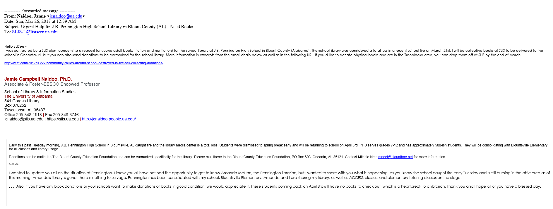 Hi all, I saw a call for donations on the Alabama SLIS listserv and I thought I'd share it. J.B. Pennington High School in …