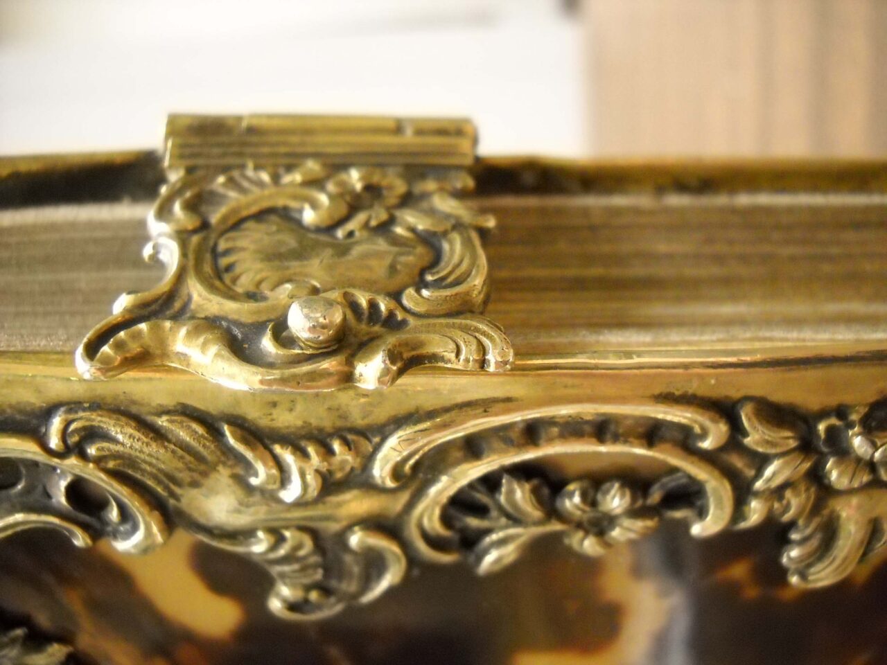 The above book is bound in smooth tortoiseshell- likely with no boards, just the tortoiseshell. It’s covered in intricate, curvaceous brasswork, very un-sexily referred to as “furniture”. The brasswork covers the front and back before extending into a pair of clasps that hold the book closed. The paper is near-pristine for its age (and was made from rag) and glows with gilted edges.