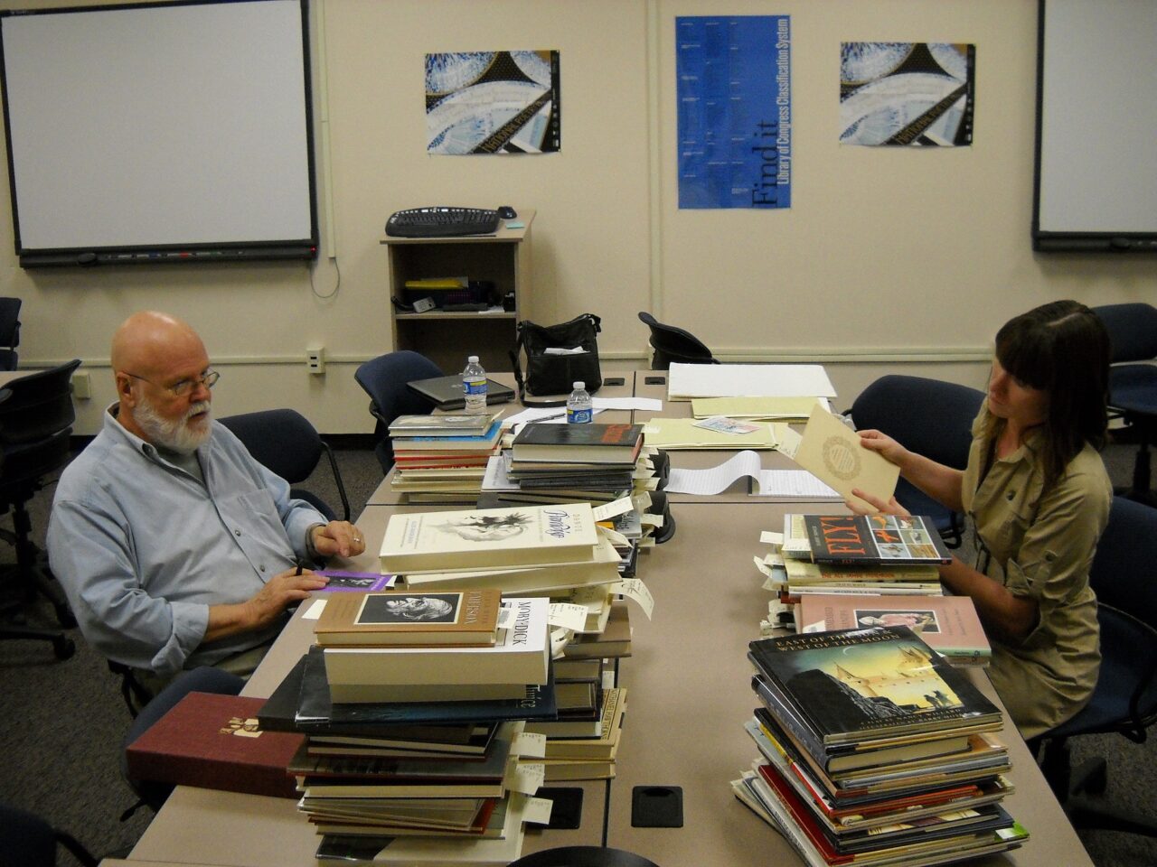 Last Friday the Special Collections department was paid a visit by a very special guest. Barry Moser, UTC alum and world-renowned artist, stopped in for a visit. We have a large collection of Mr. Moser’s work and he has been generous enough to look at some items in the past. Mr. Moser was in town & asked to come in and spend the day with the 600-plus-item collection and help us identify, date, & sign items.