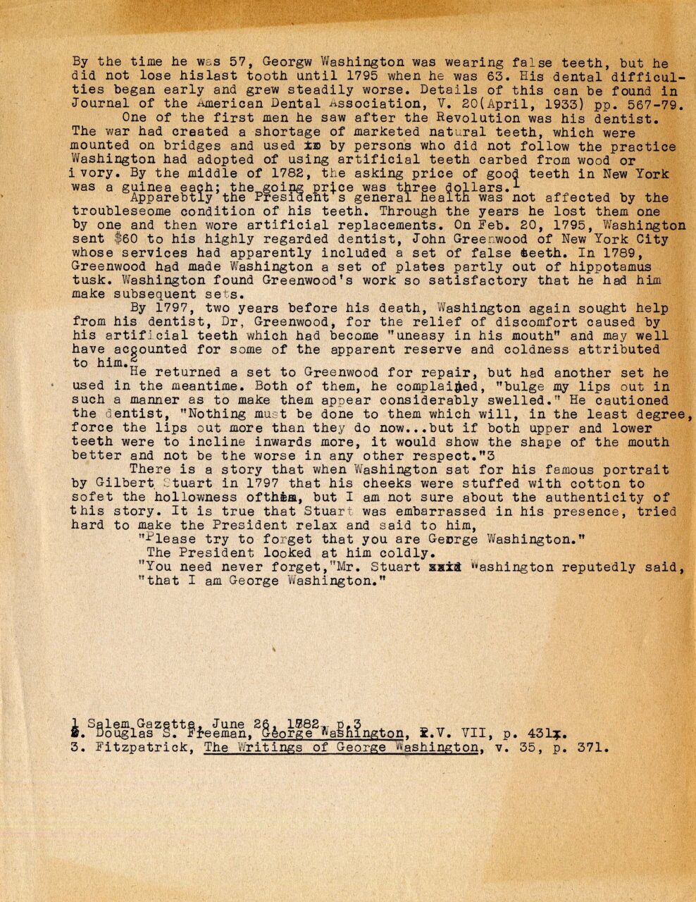 In honor of President’s Day, or George Washington’s birthday (observed), we present an interesting little bit of ephemera from one of our manuscript collections, the North Callahan Collection. A 1930 University of Chattanooga alumnus, and a recipient of the Distinguished Alumnus Award from this university, Dr. Callahan taught History at New York University and wrote several historical biographies, including a biography of George Washington. The bit (see below) that we are including did not show up in his book, but was likely a working draft for a newspaper article. Keep in mind that at the time this article was written, likely in the 1970’s, typewriters, not computers, were in use. Note the unusual composition of one set of dentures in the Callahan article. (You will need to click on the image to enlarge it.)