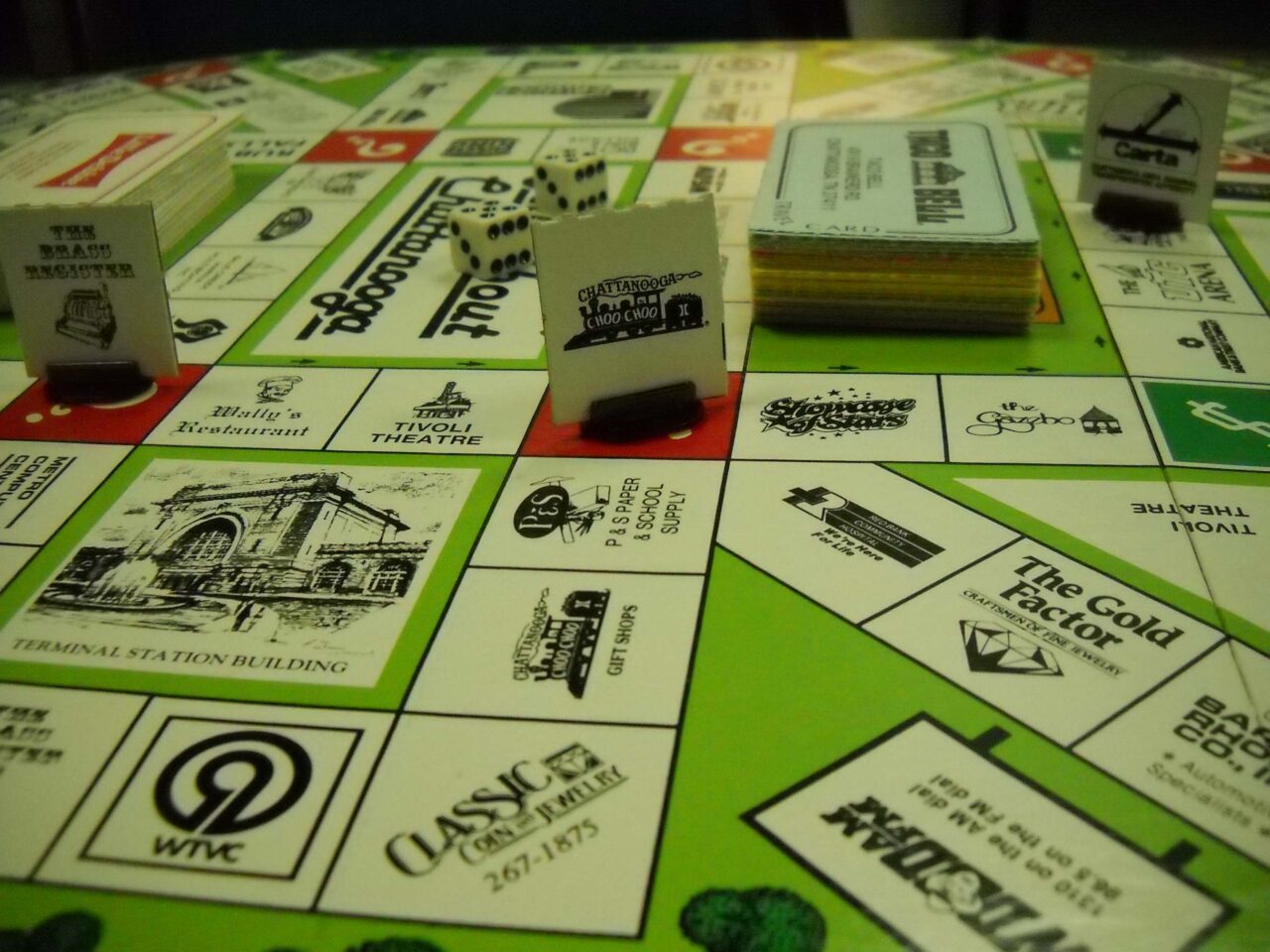 Circa 1984, a board game was created that highlighted many of the iconic businesses in and around Chattanooga at the time. We know very little about the game (entitled All About Chattanooga), but we do recognize many of the businesses. Included in the above image are game pieces for the Chattanooga Choo Choo, Carta, Little Debbie Bakery, the UTC Arena, Wally’s Restaurant, the Tivoli, and the now defunct but fondly remembered Brass Register.