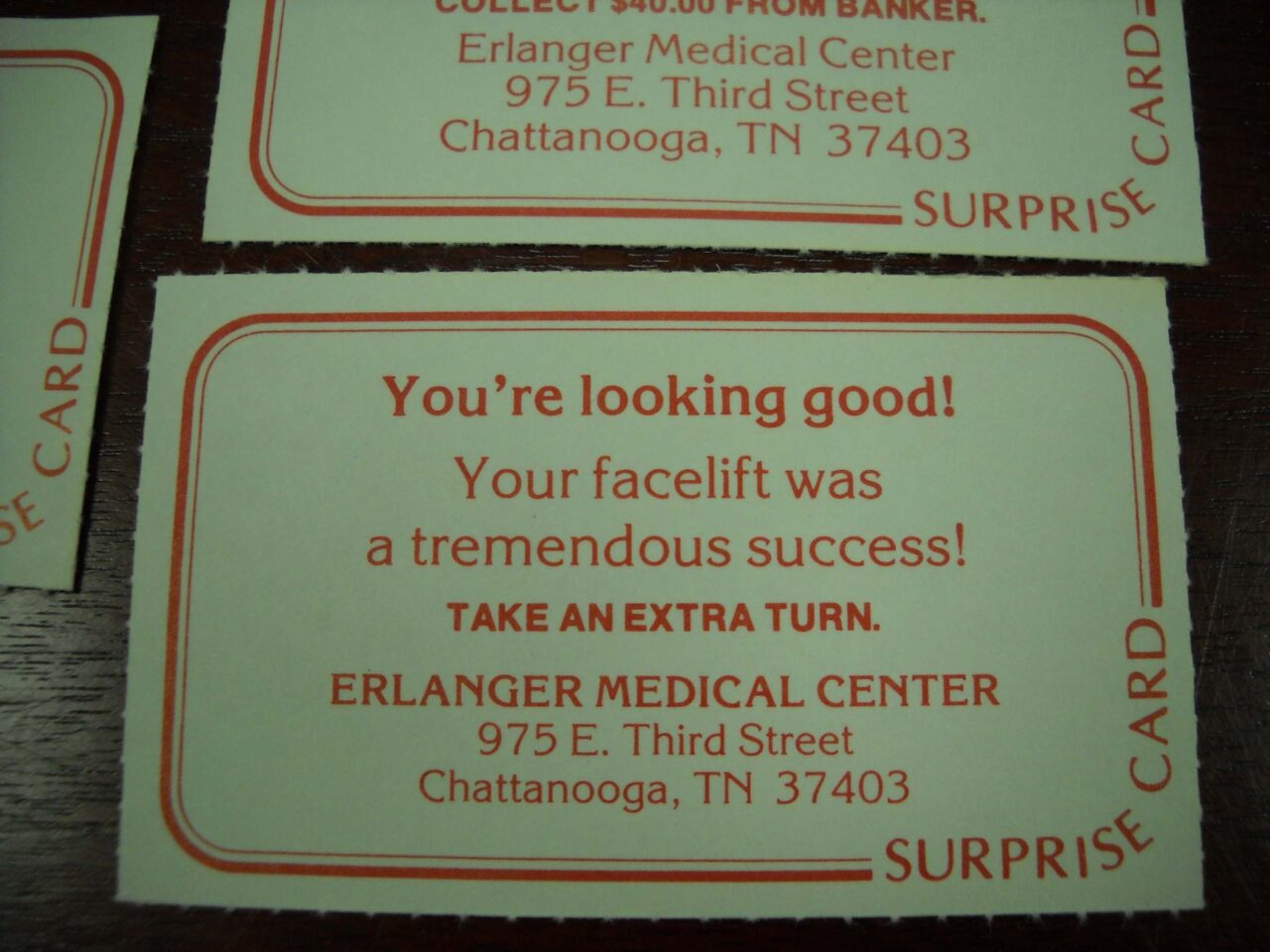 Businesses are highlighted through squares on the game board, game pieces, and cards. It appears that game play initiates from two types of playing cards. An example of the “Surprise Card” is featured below.
