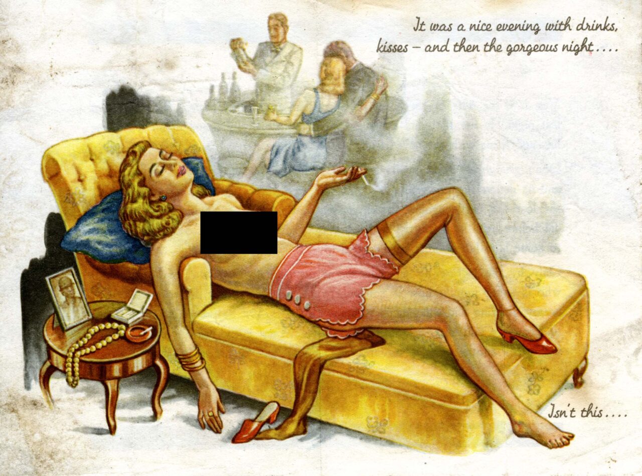 This particular leaflet was dropped in Ardennes but was likely dispersed on other fronts as well and targeted American troops. These sexualized leaflets were meant to lower the morale and resolve of Allied soldiers in the war by playing upon the notion that their wives were bored and unfaithful, but more often served as pin-up pictures rather than demoralizers. Leaflets were also dropped on British troops that detailed how the American soldiers were taking the Brits’ women while they were on the warfront. Very few of these leaflets survived. They were made of very poor quality paper and it is even rumored that soldiers used them as toilet paper. (For a short and interesting read on propaganda usage in World War II, see the PBS website on the Ken Burns’ documentary The War.)