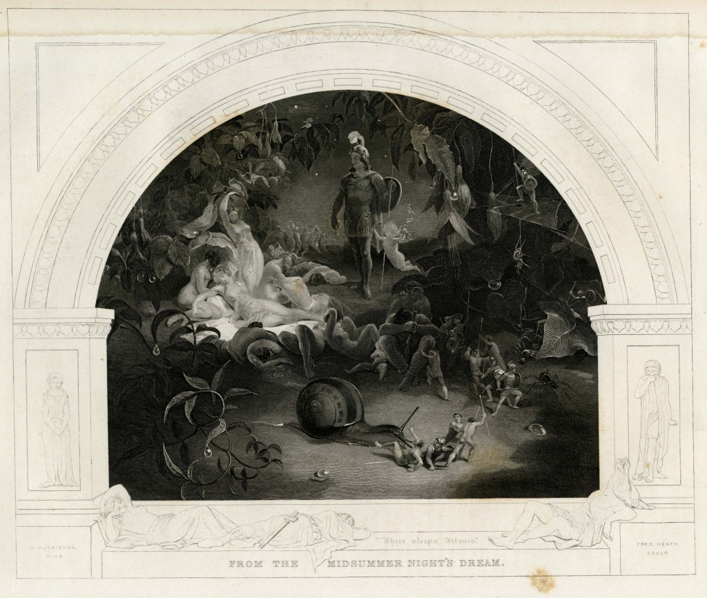 Despite the sad endings of Troilus and Cressida and Romeo and Juliet, we want to show the lovers in happier times. The print from Shakespeare’s comedy, A Midsummer Night’s Dream shows the queen of the fairies, Titania, asleep.