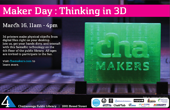 We will unveil our Replicator this Saturday, March 16 as part of the Maker Day: Thinking in 3D event at the Chattanooga Public Library’s 4th Floor. Organized by the Public Library, CO.LAB, and Chatt*Lab, this is the first event of its kind in Chattanooga and we will be joining several departments from UTC as well as players from the industrial sector such as NovaCopy and the Chattanooga Regional Manufacturing Association. Stop by to see a multitude of 3D printers in action, check out 3D scanning and design technology, hear presentations on 3D printing and the maker movement, get to know the exhibitors, and more. All event details are available at the CHA Makers website.
