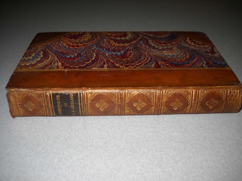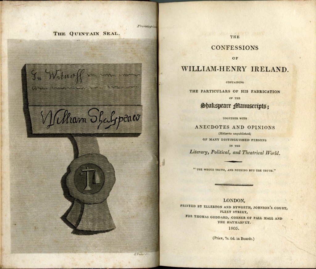 One item of interest, though, is an 1805 book titled The Confessions of William Henry Ireland. Upon looking at the title page and the illustration you can see there is a connection to Shakespeare.