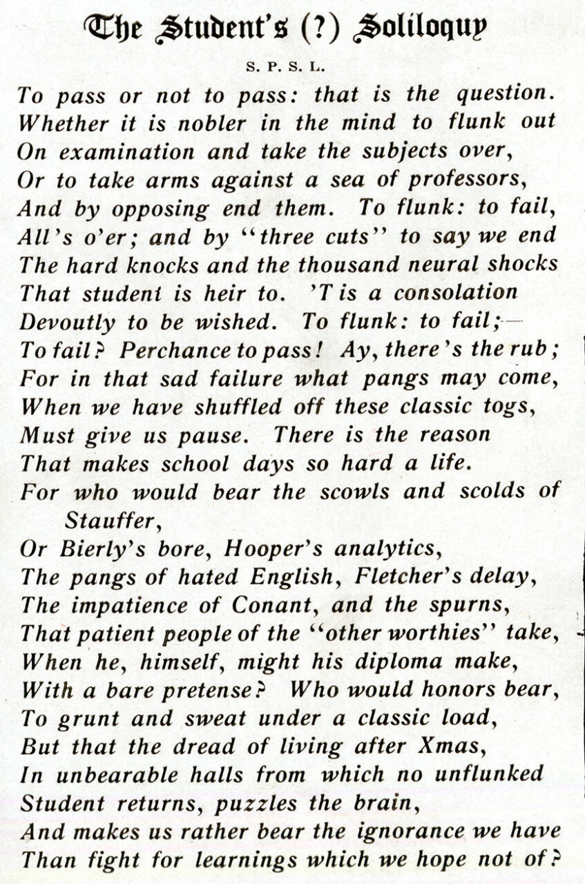 To pass or not to pass: that is the question. Read The Student's (?) Soliloquy from the 1911 student yearbook. Learn …