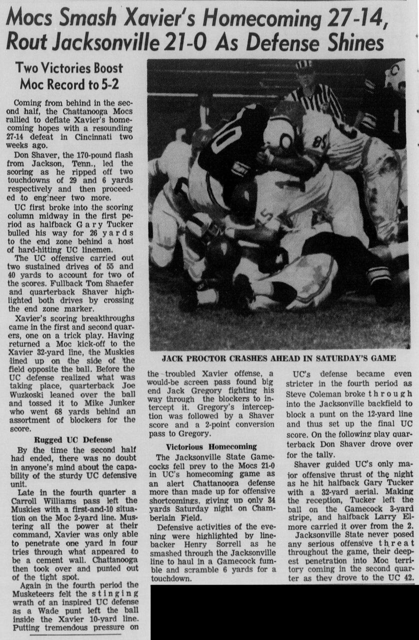 Chi Omega won first place in the Homecoming decoration context with “Track ‘Em Down Mocs.”Carole Rawls was voted Homecoming Queen.Mocs defeat the Jacksonville State Gamecocks 21-0 in the Homecoming game.