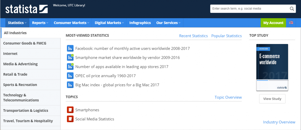 The UTC Library is happy to announce a new subscription to Statista, one of the leading providers of quantitative data and statistics on the internet. Statista offers insights on the digital market as well as trends and developments in consumer goods for over 170 industries located in over 50 countries.