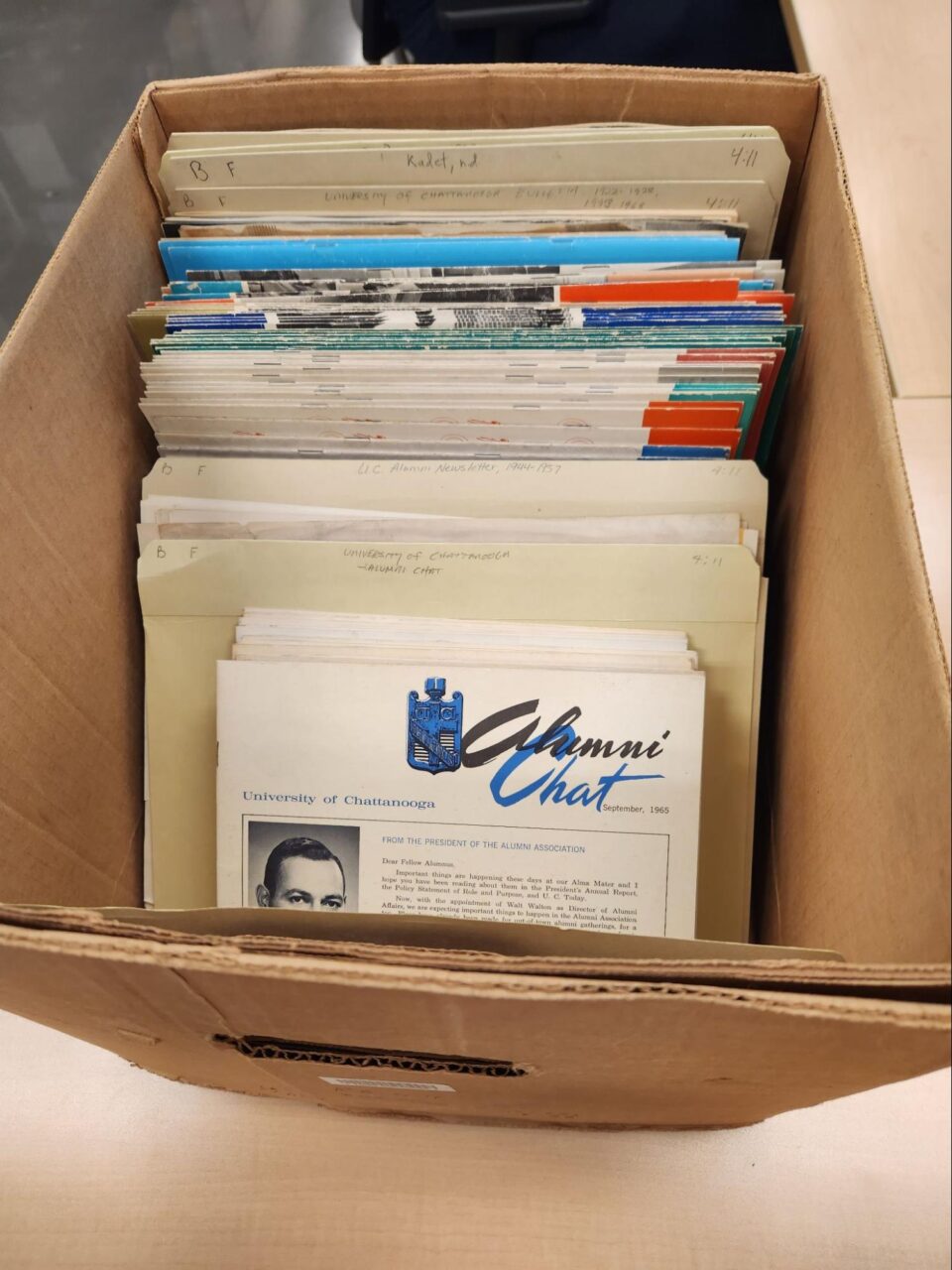The internship only lasted for one semester, but during this time I was able to gain a plethora of skills in archival work. The first collection I worked on was processing the University of Chattanooga Alumni Association newsletters and magazines. I began this project by authoring basic descriptive metadata for both the collection and for each magazine, including dates, names, and the unique identifier. I then physically rearranged the newsletters and magazines, first separating out the military newsletters from the alumni magazines and then organizing them by year in archival folders.