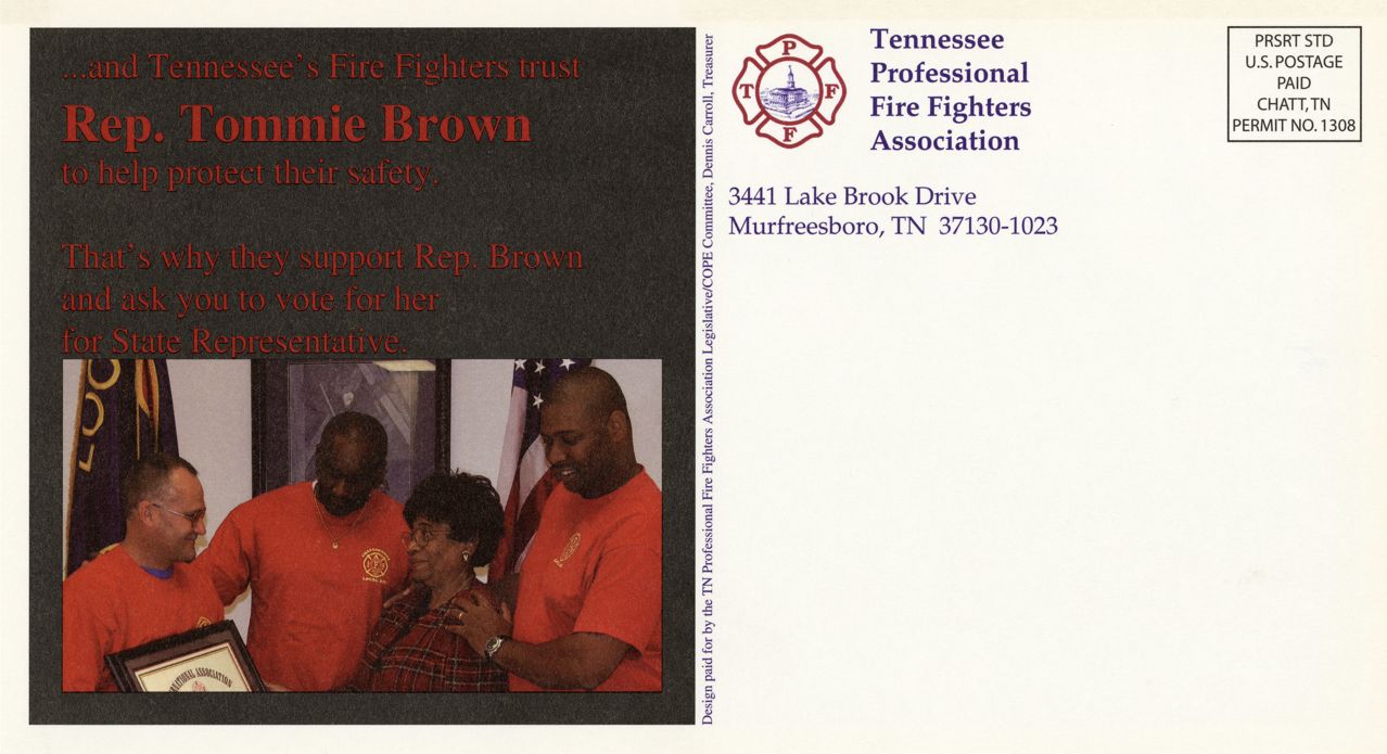 Postcard created by the Tennessee Professional Fire Fighters Association endorsing Representative Tommie F. Brown