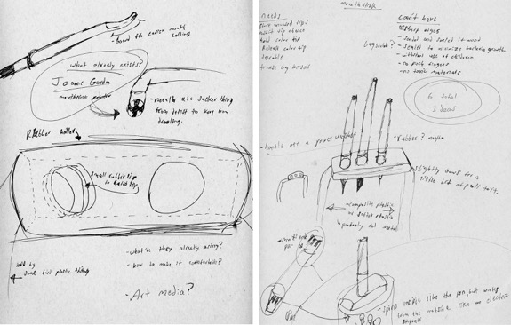 Working drawings from art student Pat Tyree’s sketchbook, possible design solutions for a tool to serve a client who makes art using her mouth.