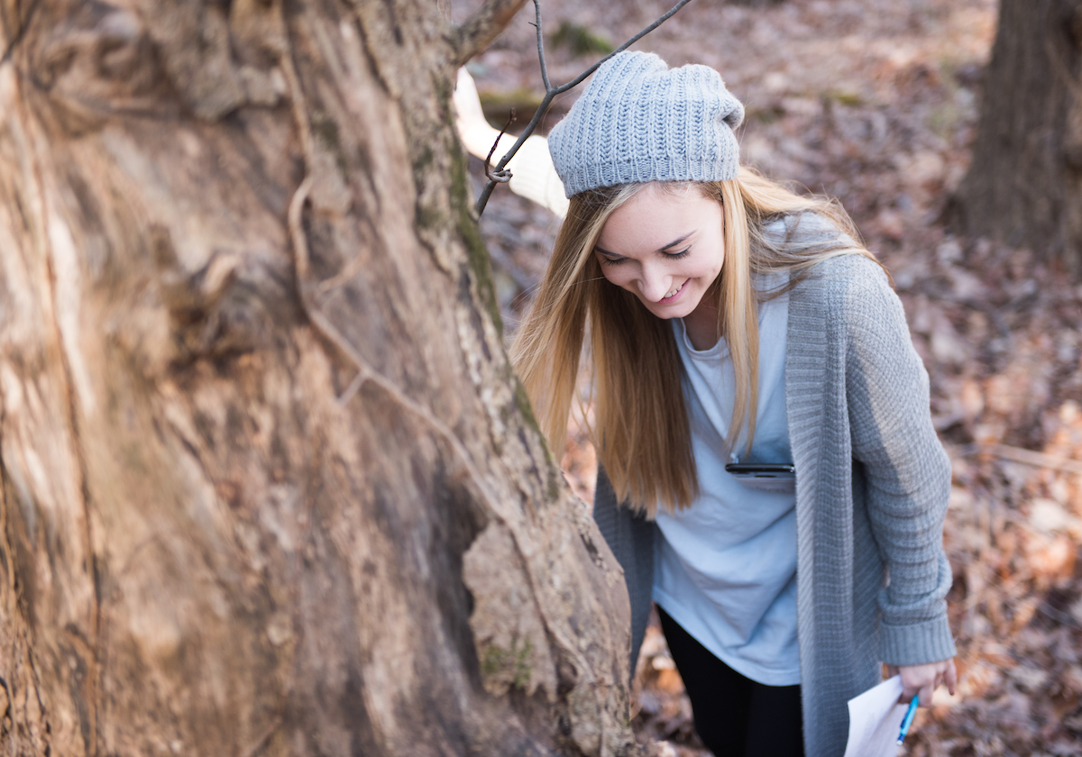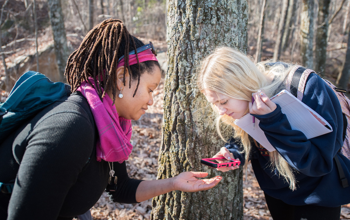 The following afternoon at the same location, groups of science students gather. They, too, cluster around trees and boulders, inspecting plants and insects. They pull out their notepads and snap photos, recording what they see.