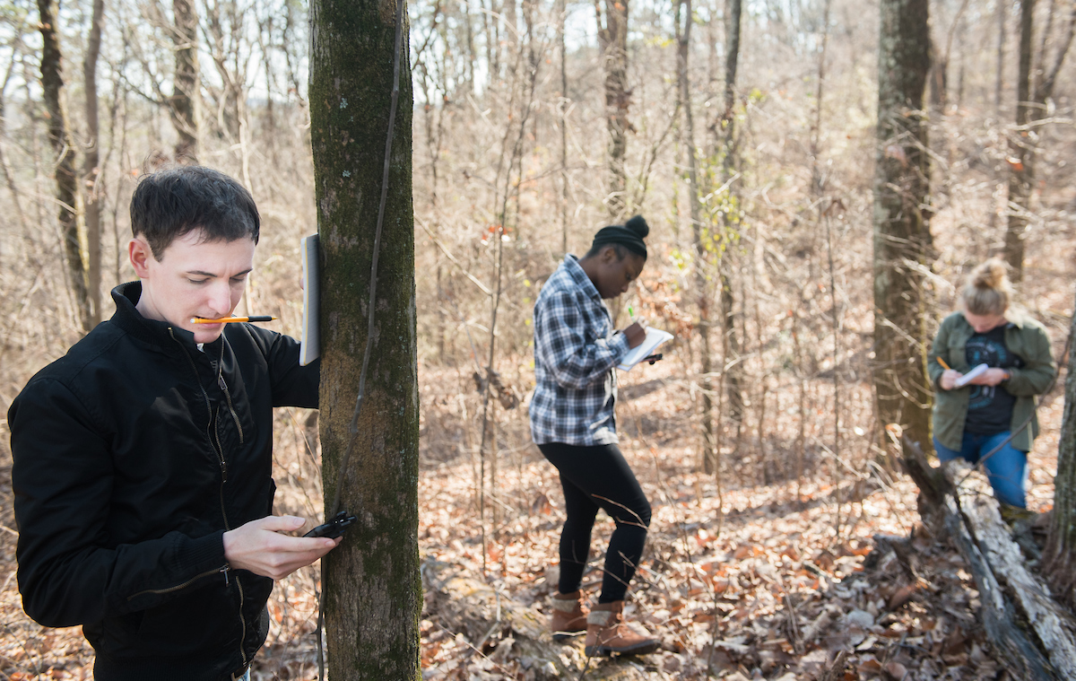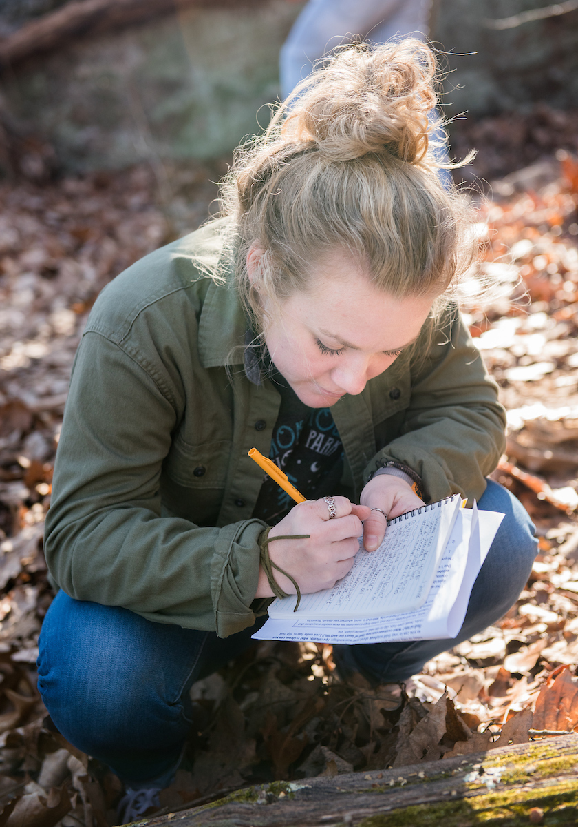 On a crisp January morning, armed with coffee, coats and sketch pads, art students are dotted along the Guild Hardy Trail at the base of Lookout Mountain. Some sit on rocks or next to patches of moss and fallen trees. They dig through mounds of leaves, run their hands over tree trunks or look into cracks of boulders. They open up sketch pads and begin to draw, mimicking the veins in the leaves, the geography of the trees.