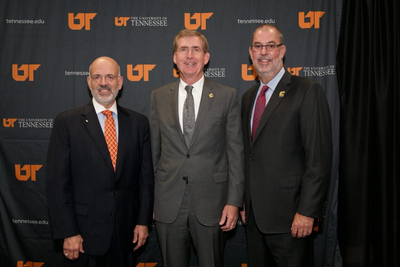 - From left, University of Tennessee System President Joe DiPietro, UTC Chancellor Steven Angle and UTC College of Business Dean Robert Dooley.