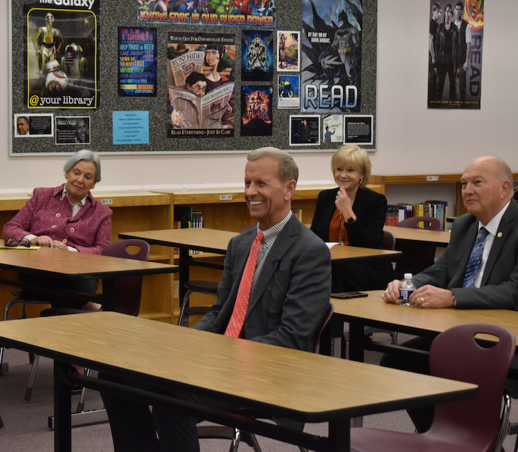 Teaching and Learning Institute students Kaylea Moore, left, and Cierra Norris, right, stand with Frank Brogan, assistant secretary in the U.S. Office of Elementary and Secondary Education, part of the U.S. Department of Education.