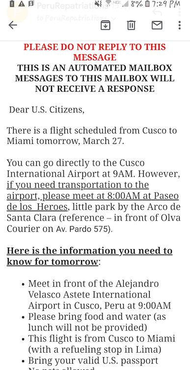 To get out of Peru, Americans put their names on a waiting list from the U.S. Embassy. Every night, a certain number of Americans would receive a notice telling them to be at the airport by 9 a.m. the next morning. They would board a plane whose ultimate destination was Miami. There was limited seating, Bailey said, so not everyone got out at the same time.