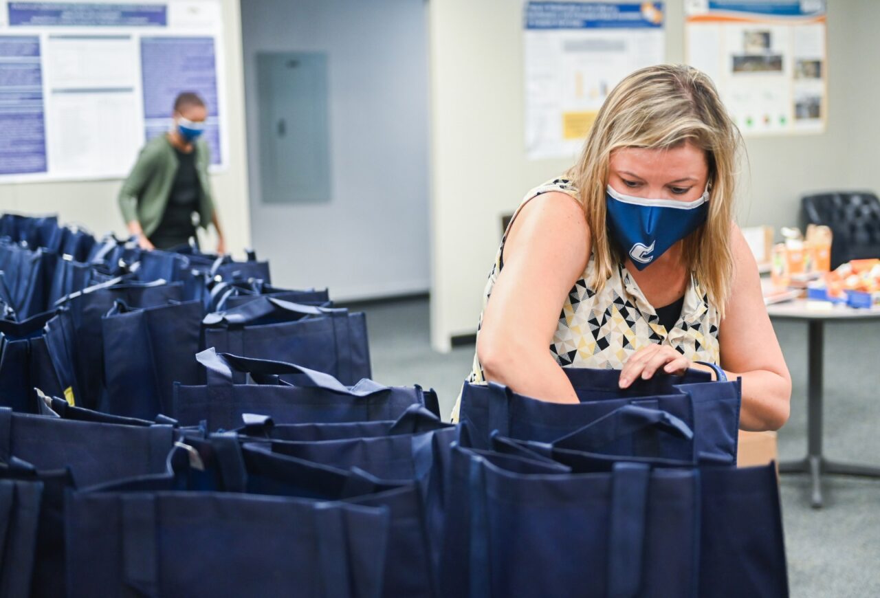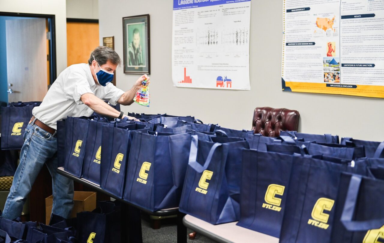 Jill Shelton and Tomorrow Arnold, both in the Department of Psychology, load goodie bags for the residents of Summit View Senior Community.