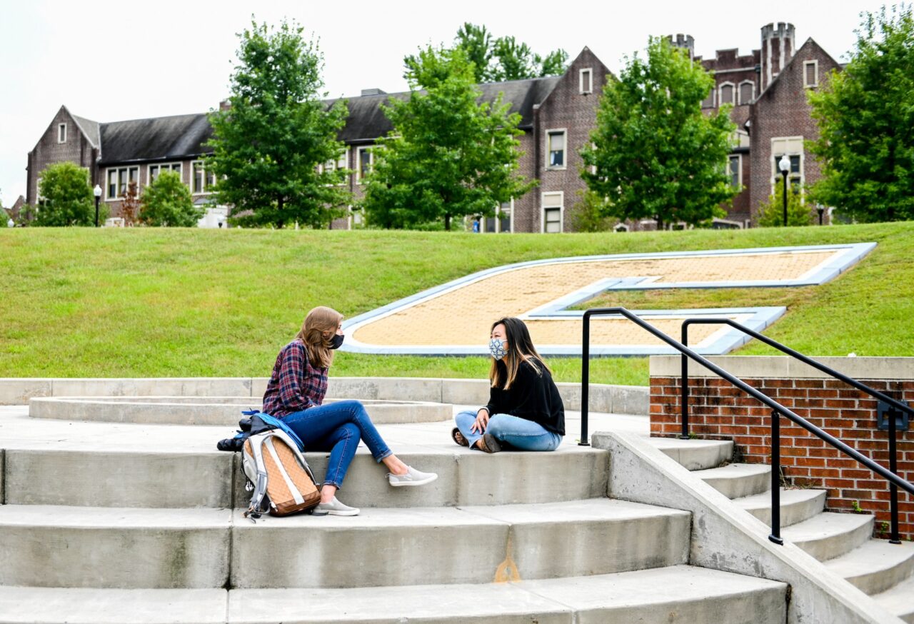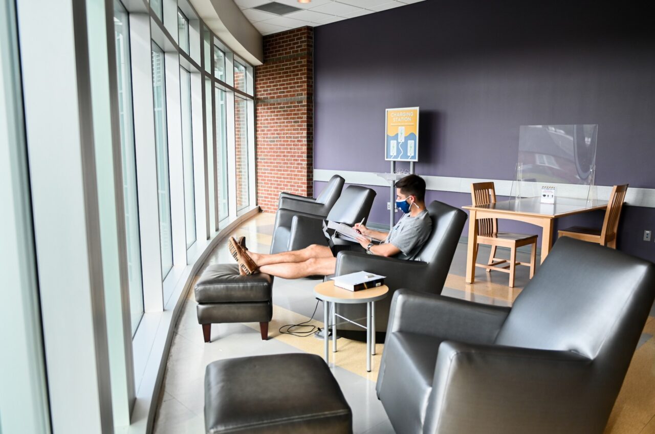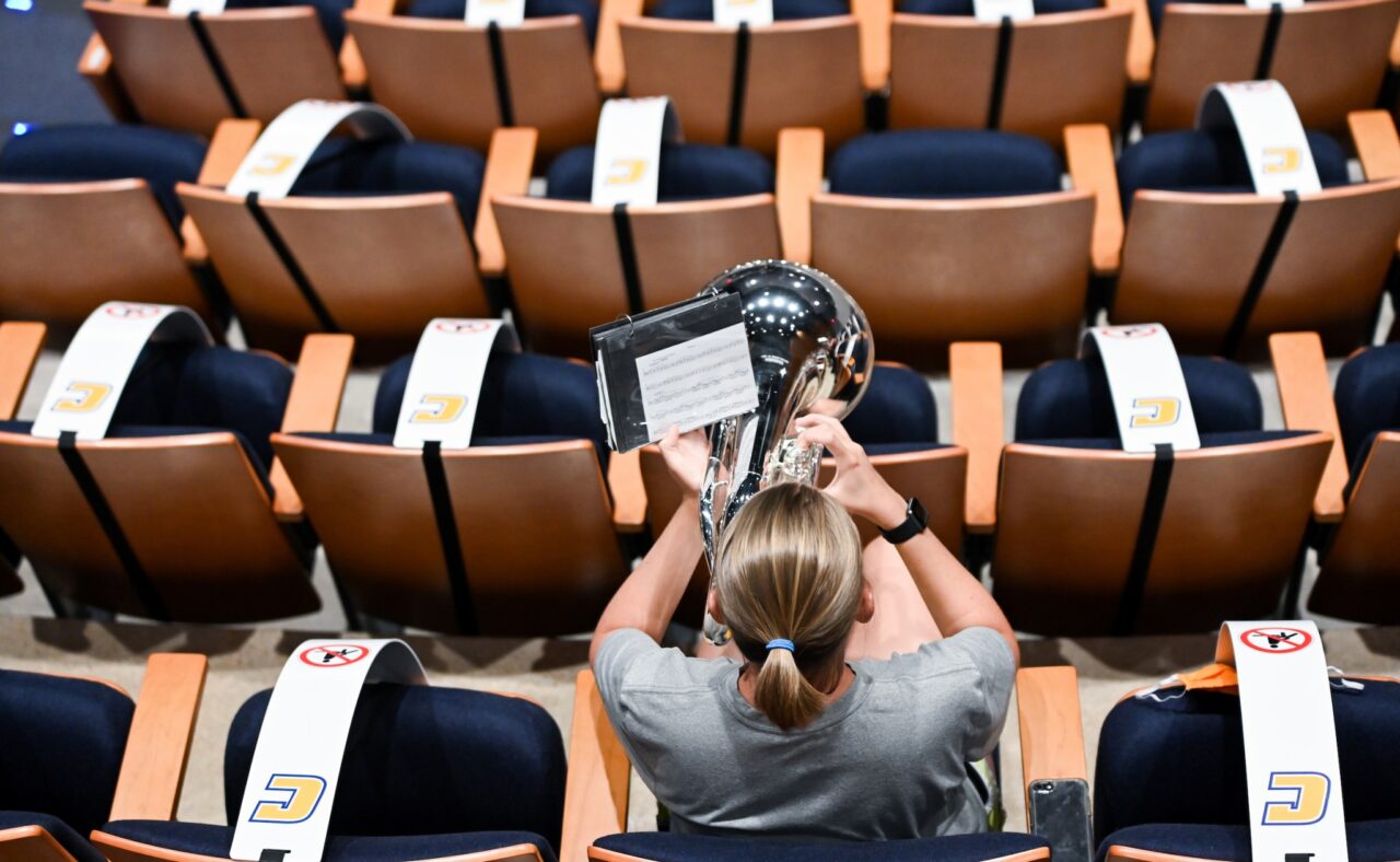 With social distancing tape in place, music students practice in the Roland B. Hayes Auditorium in the Fine Arts Center.